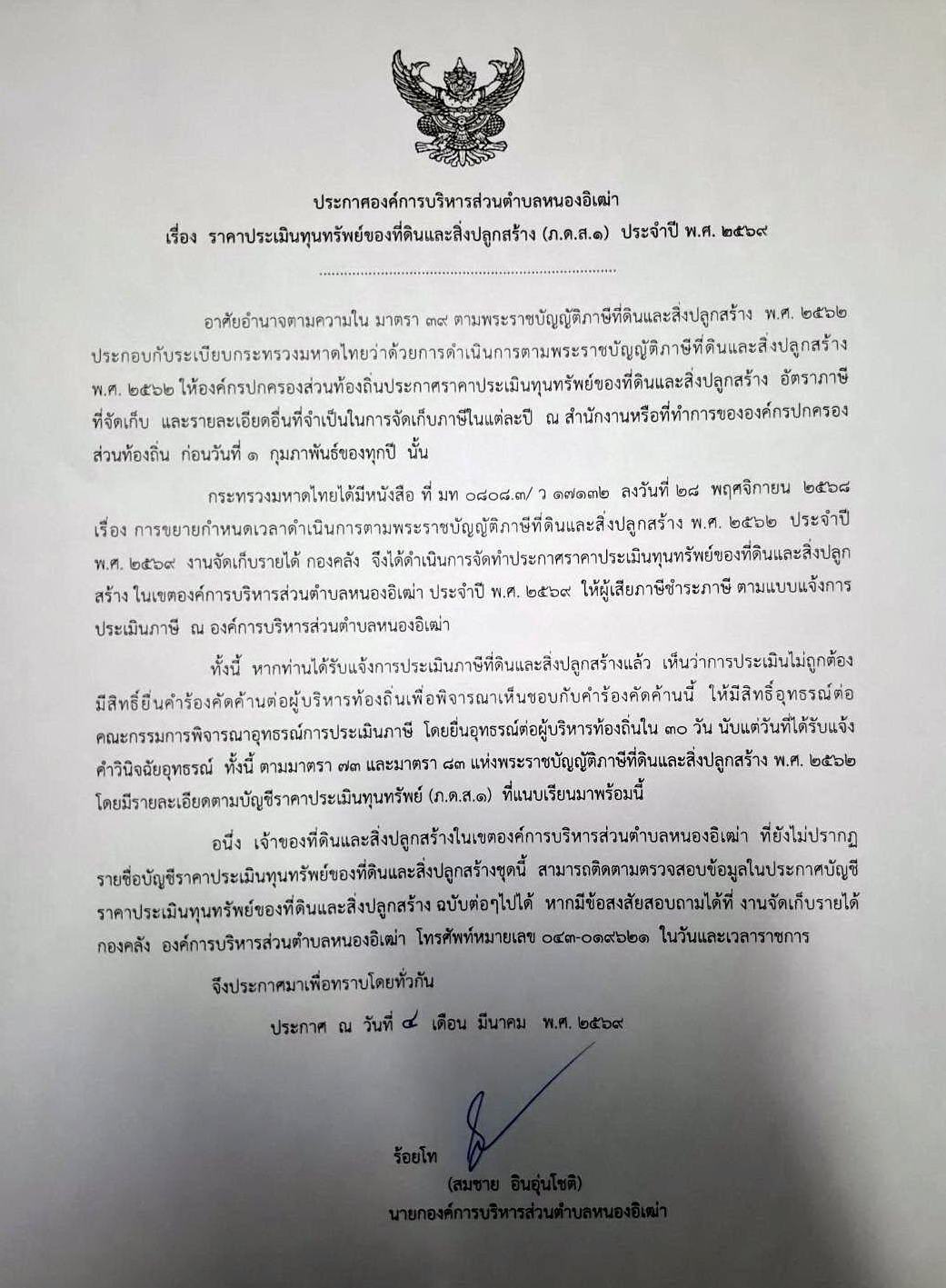 ประกาศ อบต.หนองอิเฒ่า เรื่อง ราคาประเมินทุนทรัพย์ของที่ดินและสิ่งปลูกสร้าง (ภ.ด.ส.1) ประจำปี พ.ศ. 2569 |