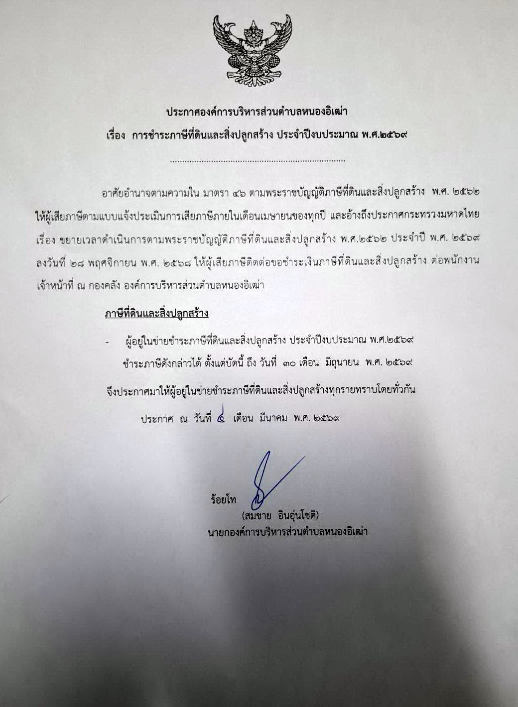 ประกาศ อบต.หนองอิเฒ่า เรื่อง การชำระภาษีที่ดินและสิ่งปลูกสร้าง ประจำปีงบประมาณ พ.ศ. 2569 |